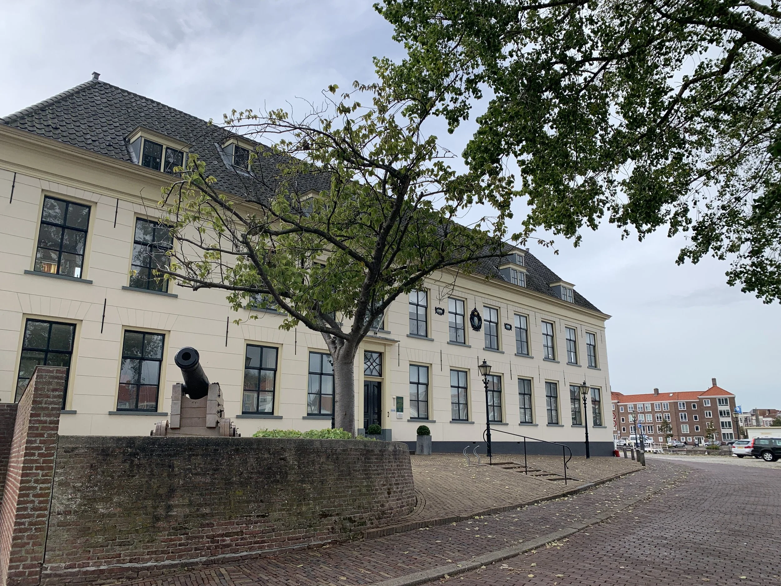 Zeeland has been the site of battles against the French, the Germans, and allied troops who cleared the area after WW2. Significant damage left only a quarter of Middleburg standing, but the East India Company buildings are still there. A cannon faces the harbour. On the back of the building is a recent glass conservatory. It looks like apartments now.